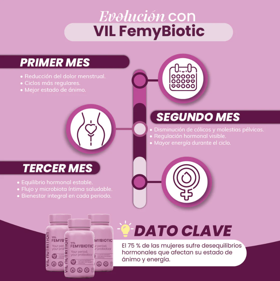 Femybiotic es una fórmula avanzada diseñada para apoyar la regulación del ciclo menstrual, el equilibrio hormonal y el bienestar íntimo femenino. Actúa desde el eje hormonal–digestivo para favorecer estabilidad durante todo el mes, ayudando a disminuir molestias cíclicas y promoviendo balance emocional y metabólico. Ideal para mujeres que buscan un acompañamiento diario, natural y constante para su salud menstrual.